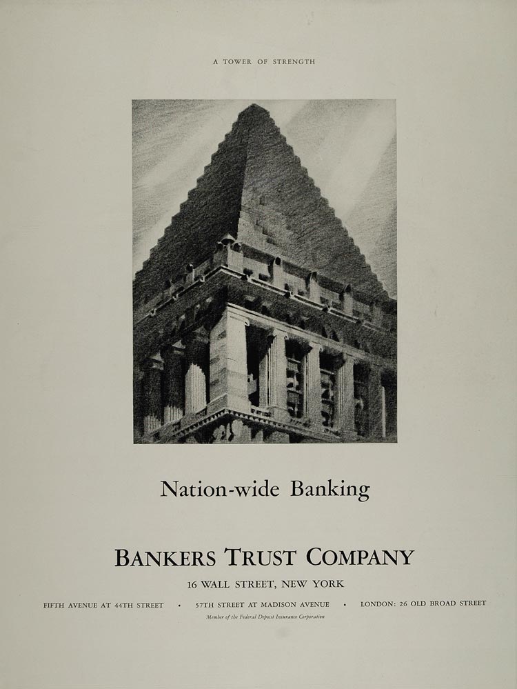 This is an original 1938 black and white print ad for the Bankers Trust Company, 16 Wall Street, New York City with a great illustration of the pyramid top of this landmark building.