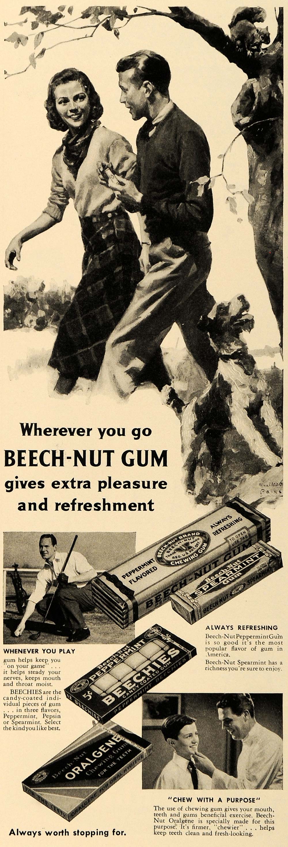 This is an original 1938 black and white print ad for the Beech-Nut Spearmint Gum and Beech-Nut Oralgene.