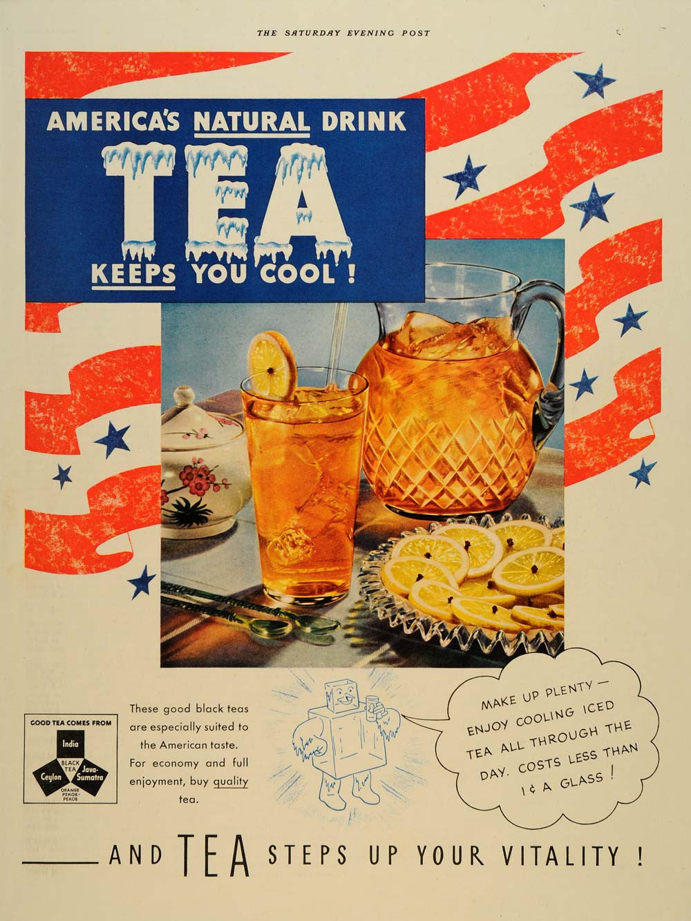 This is an original 1938 color print ad for refreshing black teas. This ad promotes its inexpensive, natural, quality tea that is especially designed for the American taste. This would look great framed!