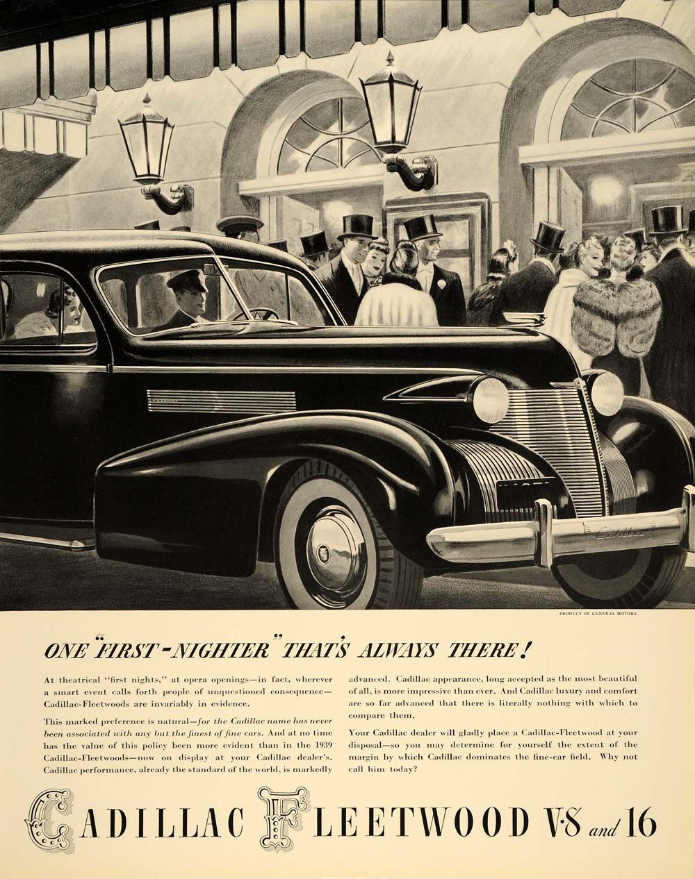 This is an original 1938 Great Depression Era black and white print ad for Cadillac Fleetwood V8 and V16 automobiles, complete with a fantastically fancy illustration.