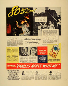 This is an original 1938 color print ad for Camel Cigarettes with endorsements from 20th Century Limited engineer, Bob Sharpe; S. Odis Walding, National All-Gauge Skeet Shooting Champion; Mozelle Hubbard, cashier of a famous Hollywood restaurant; and tobacco growers, James Graves, B. F. Bivins, and Henderson Carroll.