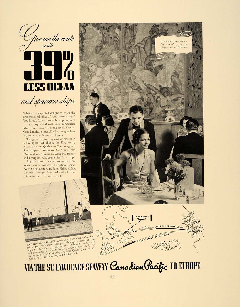 This is an original 1938 black and white print ad for travel to Europe via the St. Lawrence Seaway on-board the ships of Canadian Pacific Steamship Company. Shown here is the tennis court of the RMS