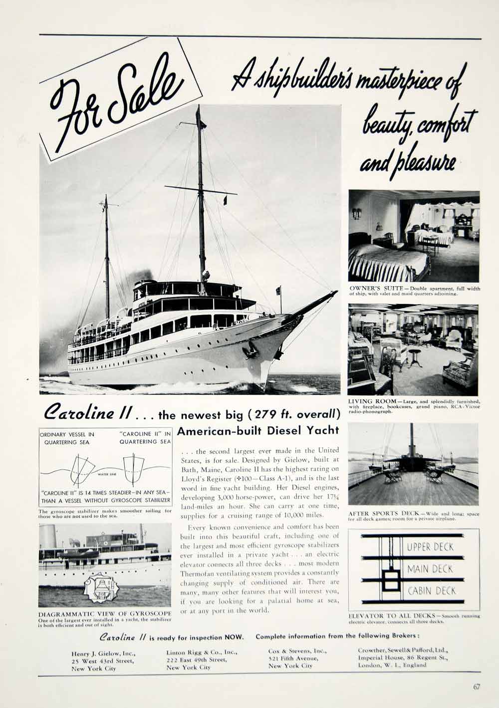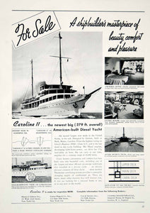 This is an original 1938 black and white print ad for the Caroline II private yacht made by Gielow in Bath, Maine.