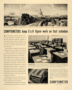 This is an original 1938 black and white print ad for the Comptometer, featuring images of the Chesapeake and Ohio Railway Company's Auditor of Revenues in Richmond, Virginia, as well as the George Washington, Crack Chesapeake and Ohio Flier pulling out of Washington D.C.