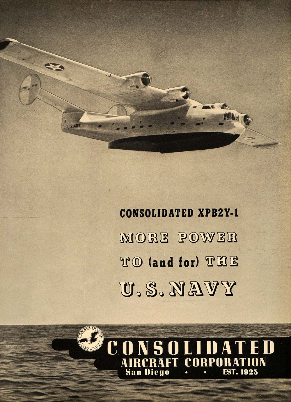 This is an original 1938 black and white print ad for the Consolidated Aircraft Corporation in Sand Diego, California. This ad specially features the Consolidated XPB2Y-1 for the United States Navy.