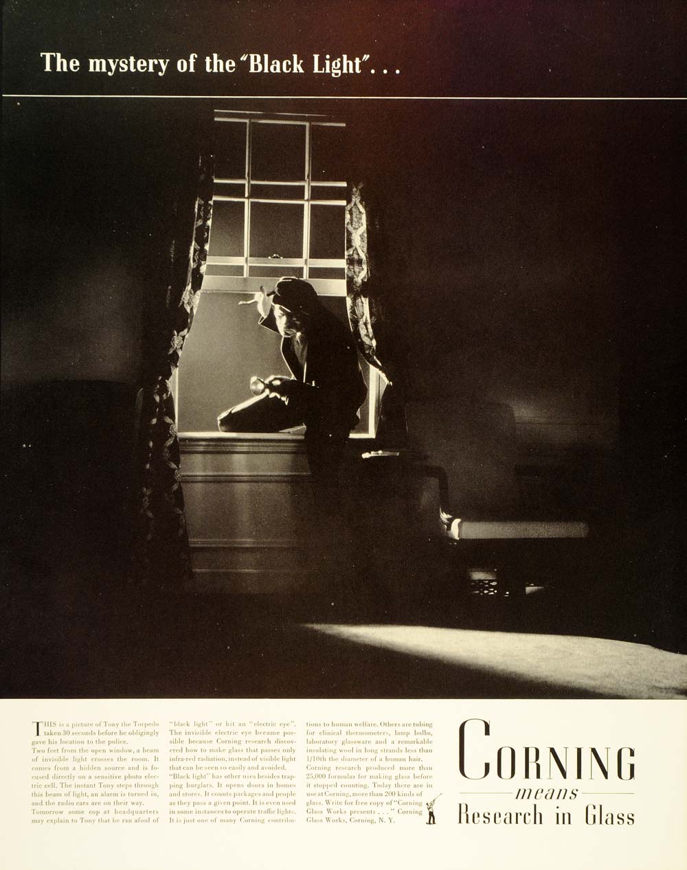 This is an original 1938 black and white print ad for the Corning Glass Works of Corning, NY.