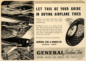 This is an original 1938 black and white print ad for General Airplane Tires, a product by General Tire and Rubber Company in Akron, Ohio.