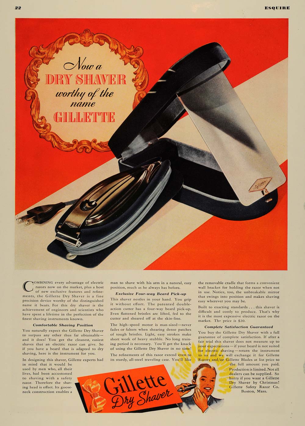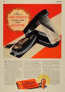 This is an original 1938 color print ad for the Gillette Dry Shaver, a product by Gillete Safety Razor Company in Boston, Massachusetts.