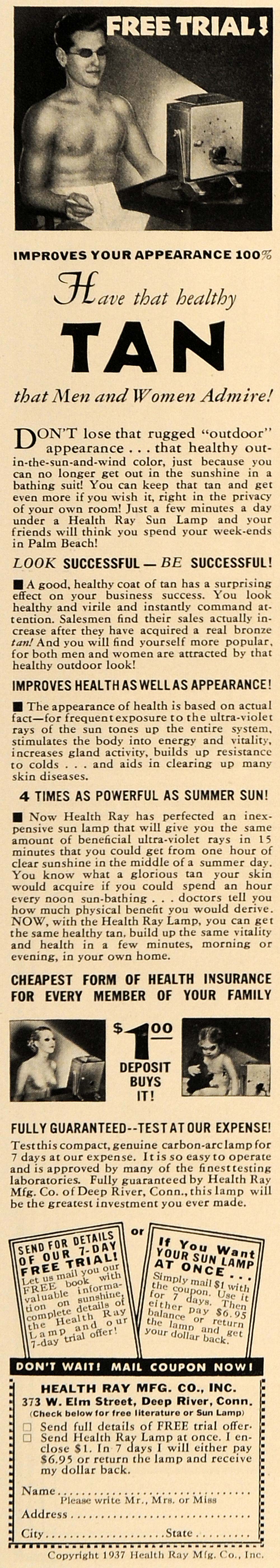 This is a small original 1938 black and white print ad for the Health Ray Sun Lamp from Health Ray Manufacturing Company, Incorporation located at 373 W. Elm Street, Deep River, Connecticut.