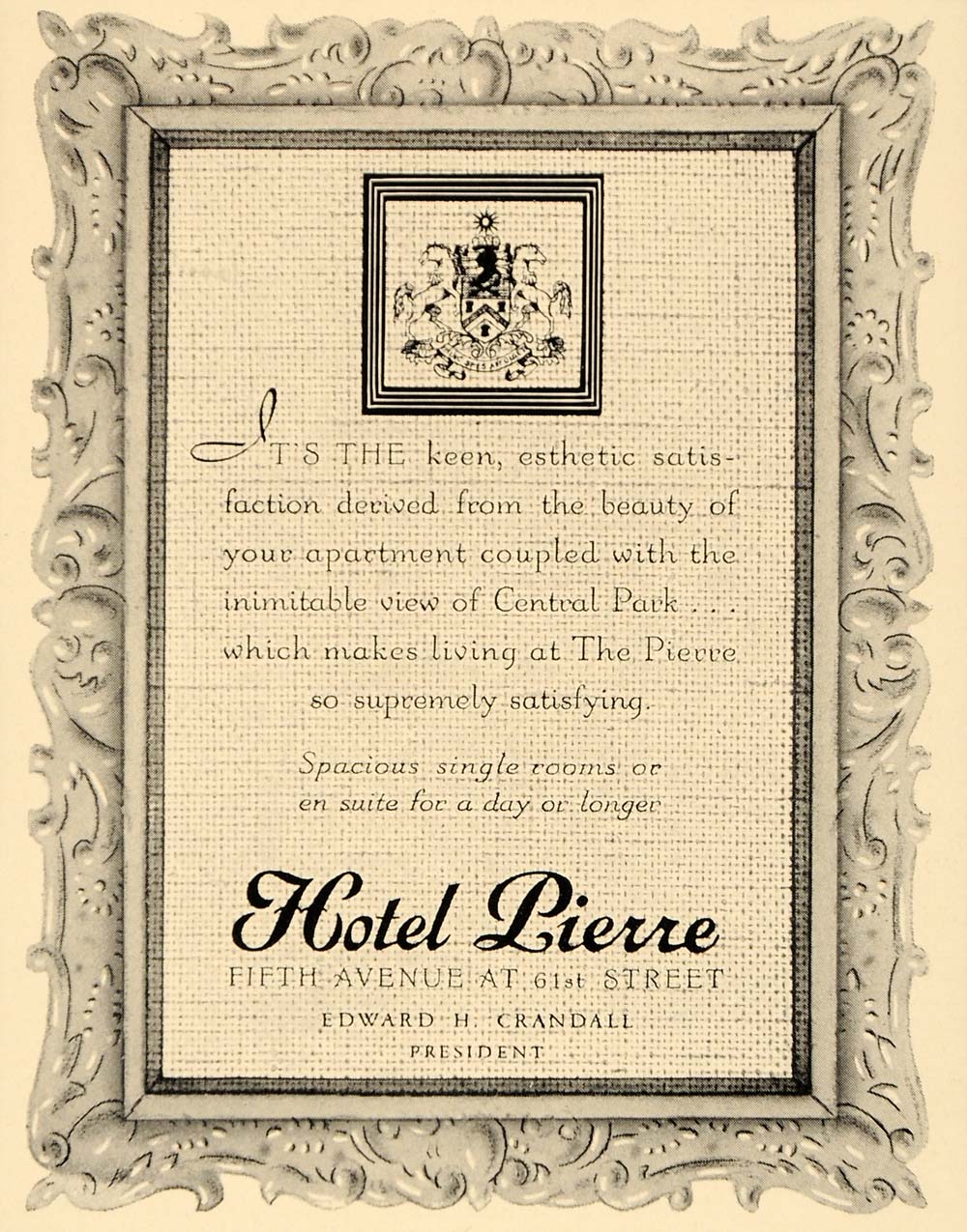 This is an original 1938 black and white print ad for the Hotel Pierre in New York City.