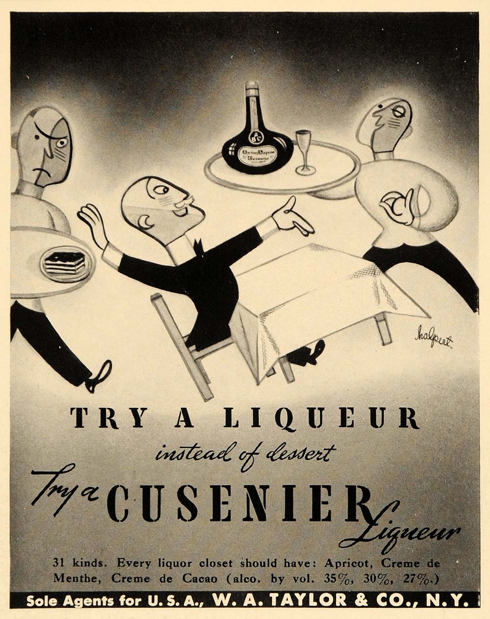 This is an original 1938 black and white print ad for Cusenier Liqueur.