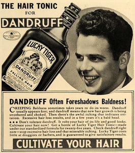 This is an original 1938 black and white print ad for the Lucky Tiger Dandruff Hair Tonic from Lucky Tiger Manufacturing Company.