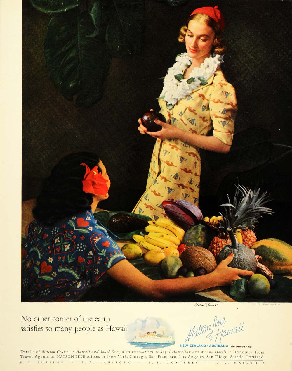 Keywords specific to this image: Australia, Travel Agent, Exotic Vacations, Vacation Spots, Alternative Travel, Exotic Travel, Honolulu, New York, Los Angeles, Chicago, San Diego, Seattle, Portland, Royal Hawaiian Hotels, S.S. Lurline, S.S. Monterey, S.S. Matsonia, S.S. Mariposa Vintage Advertising