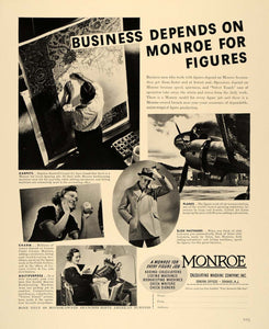 This is an original 1938 black and white print ad for the Monroe Calculating Machine Company out of Orange, New Jersey. This ad features images of United Air Line planes, the Bigelow-Sanford Carpet Company, Ponds cream and the Lamont Corliss Company.