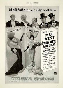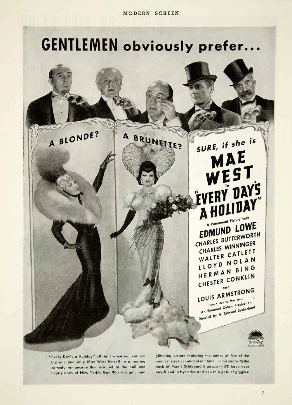 This is an original 1938 black and white print ad for the 1937 Paramount Pictures musical movie comedy "Every Day's a Holiday," directed by A. Edward Sutherland and starring Mae West, Edmund Lowe, Charles Butterworth, and Louis Armstrong; screenplay by Mae West. An Emanuel Cohen Production.