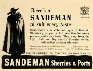 This is an original 1938 black and white print ad for the Sandeman Sherries & Ports from McKesson & Robbins, Inc. located in New York.