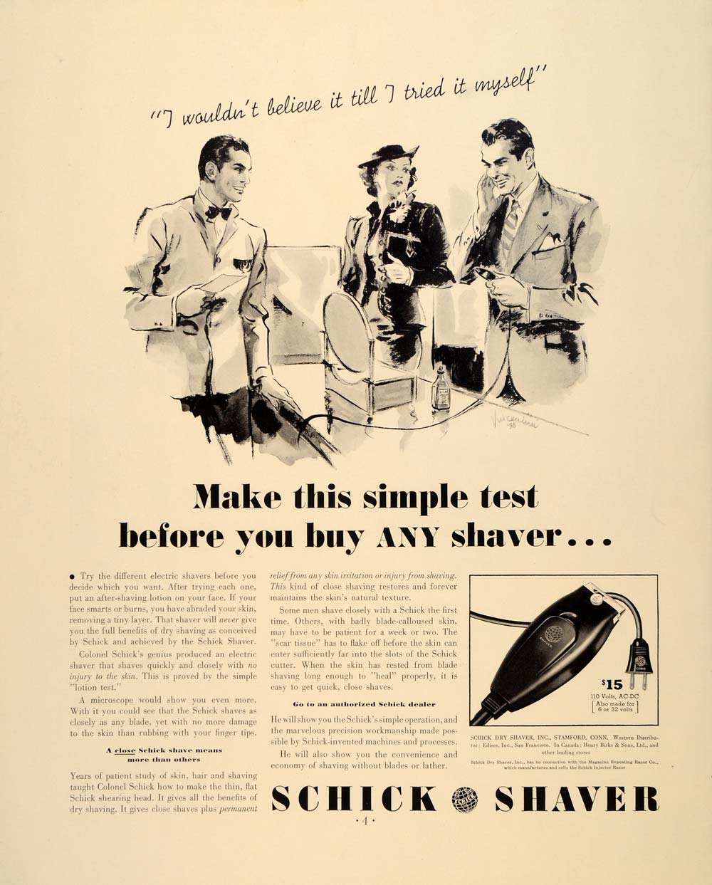 This is an original 1938 black and white print ad for Schick shaver from Schick Dry Shaver Incorporation located in Stamford, Conn.