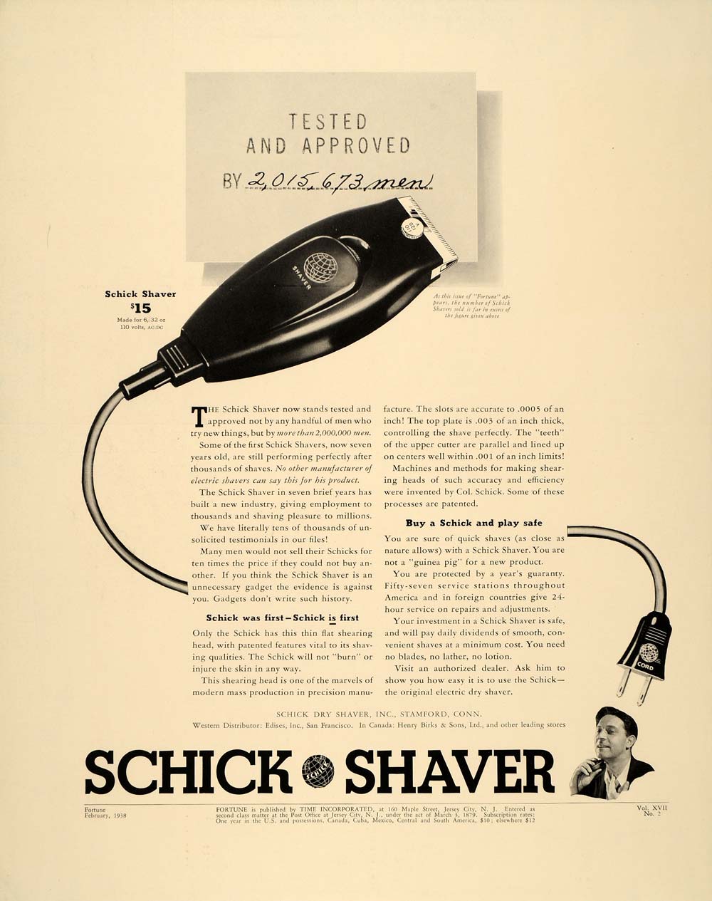 This is an original 1938 black and white print ad for the Schick Electric Shaver from Schick Dry Shaver, Inc. of Stamford, Connecticut.