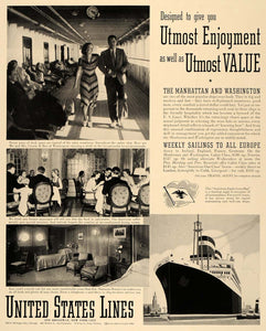 This is an original 1938 black and white print ad for United States Cruise Lines, located on Broadway in New York City. This ad features their ships the Manhattan and the Washington.