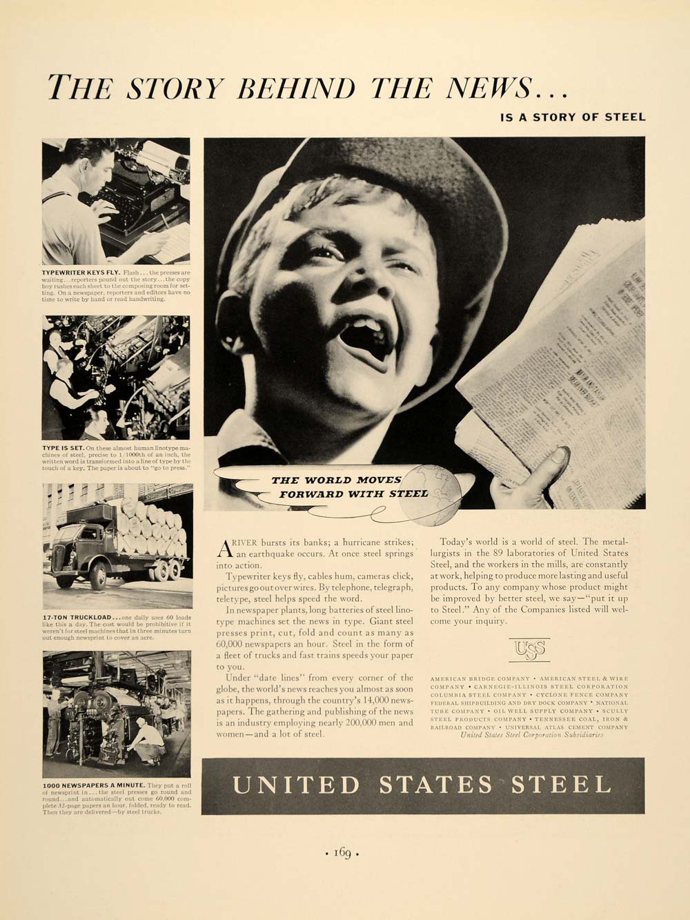 This is an original 1938 Great Depression Era black and white print ad for United States Steel.