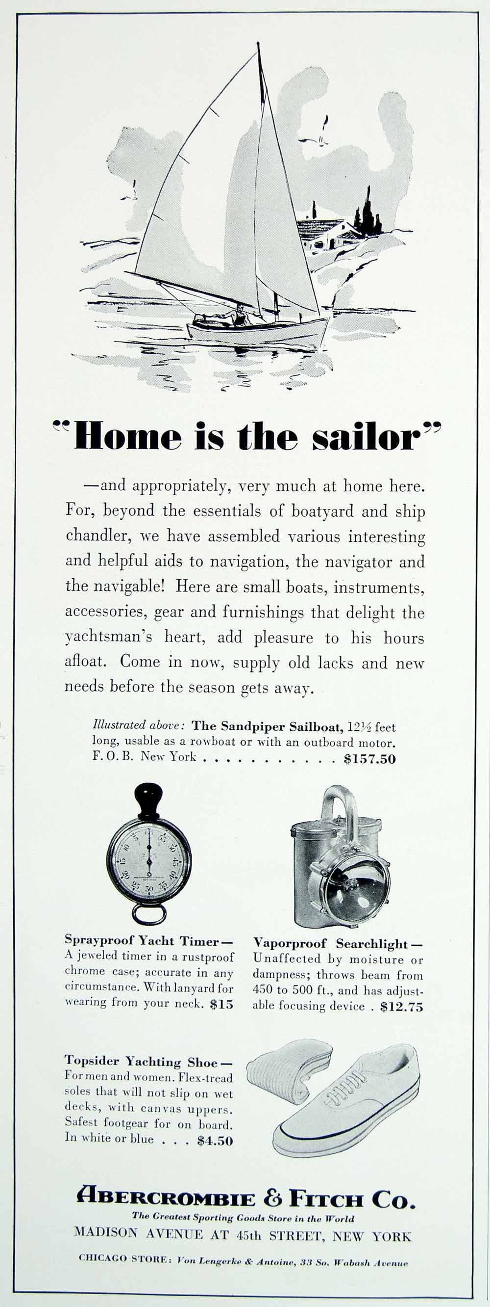 This is an original 1938 black and white print ad for small boats and navigation equipment - the Sandpiper Sailboat, yacht timer and searchlight, plus yachting shoes - from Abercrombie & Fitch Co, Madison Avenue at 45th Street, NYC.
