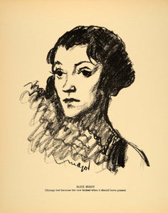 This is an original 1938 lithograph of a drawing by Henry Major, with a caption by humorist "Bugs" Baer, of film actress Alice Brady (1892 - 1939).
