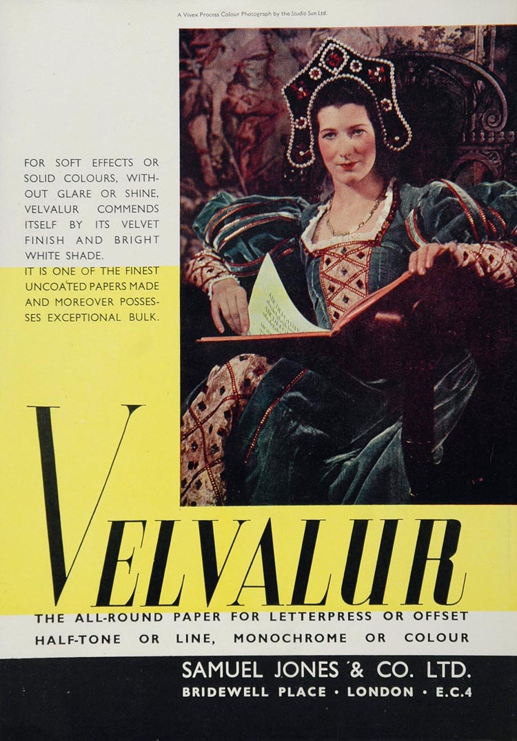 This is an original 1938 ad for Velvalur printing paper from Samuel Jones & Co., Ltd., Bridewell Place, London. This ad includes a gorgeous photo of a lady in Renaissance dress.