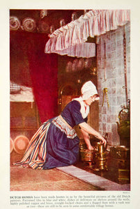 This is an original 1938 color print of the interior of a Dutch home, being cleaned by a woman in traditional Danish costume.