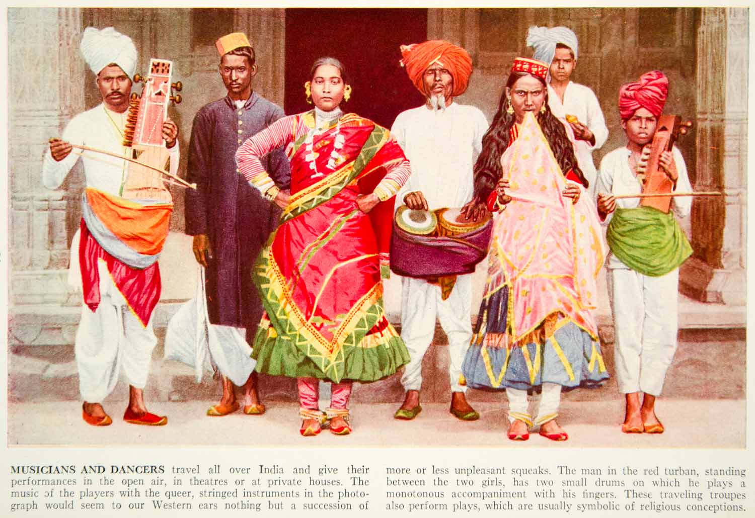 This is an original 1938 color print of a group of musicians and dancers from India, showing off their traditional instruments and costumes.