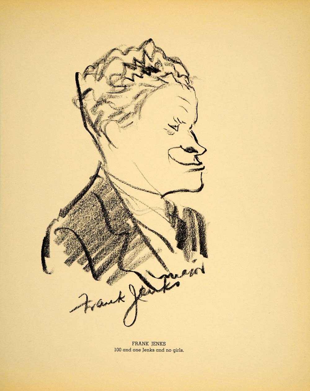 This is an original 1938 lithograph of a drawing by Henry Major, with a caption by humorist "Bugs" Baer, of vaudeville entertainer and film actor Frank Jenks (1902 - 1962).