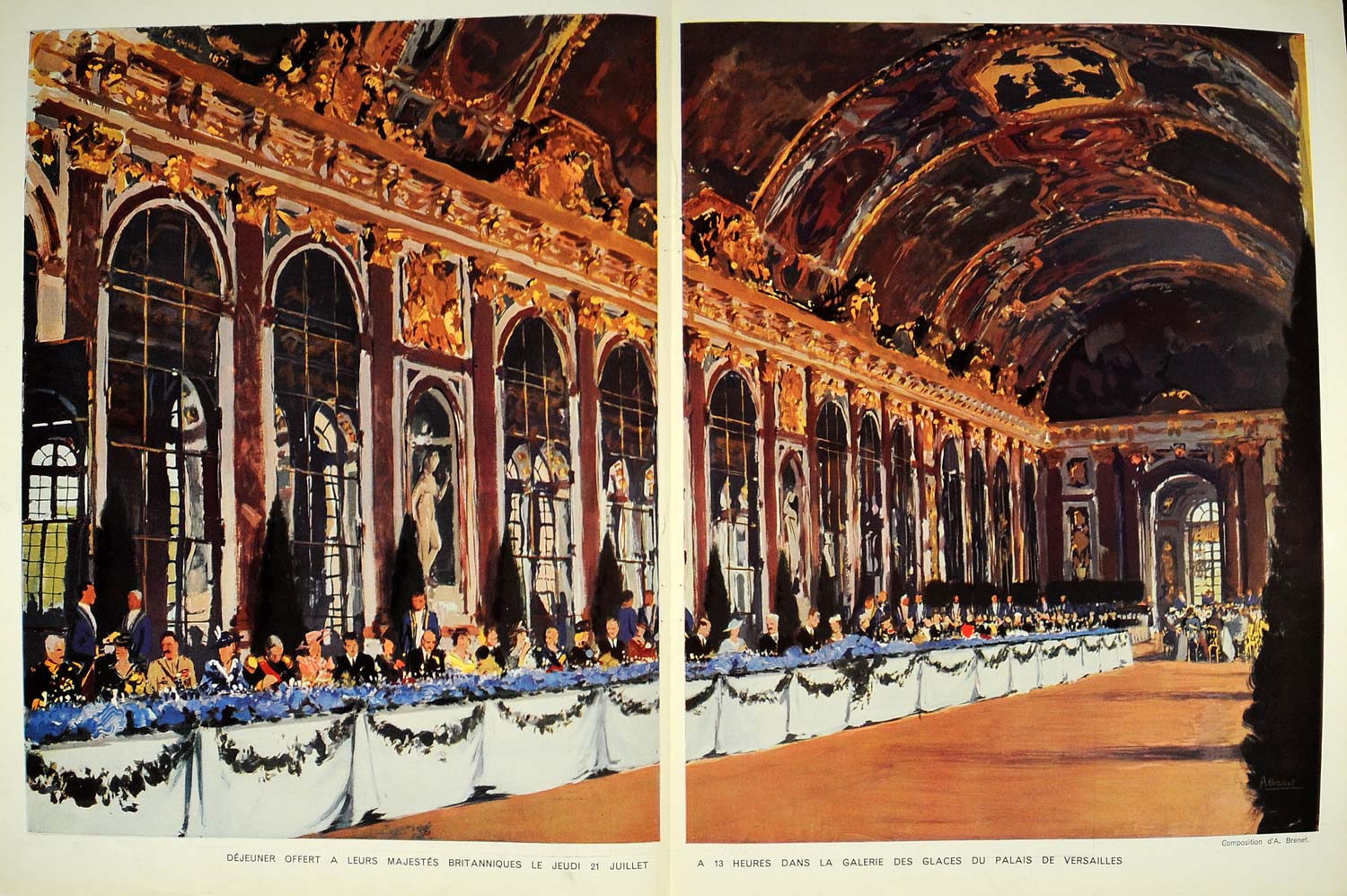 This is an original 1938 double-page color print of a lunch held for the visiting British sovereigns, George VI and Queen Elizabeth, in the Galerie des Glaces (Hall of Mirrors) at Versailles. (Please note that there is printing on the reverse.)