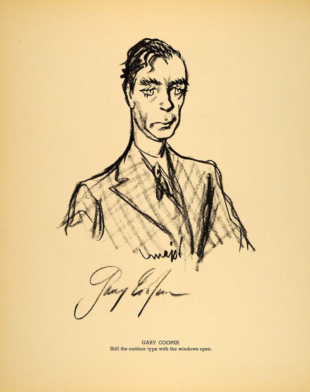 This is an original 1938 lithograph of a drawing by Henry Major, with a caption by humorist "Bugs" Baer, of popular film actor Gary Cooper (1901 - 1961).