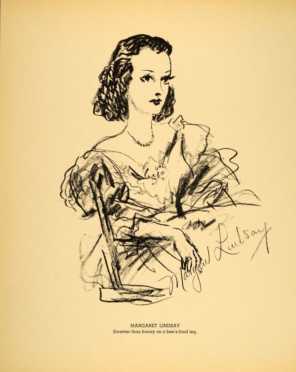 This is an original 1938 lithograph of a drawing by Henry Major, with a caption by humorist "Bugs" Baer, of film actress Margaret Lindsay (1910 - 1981).