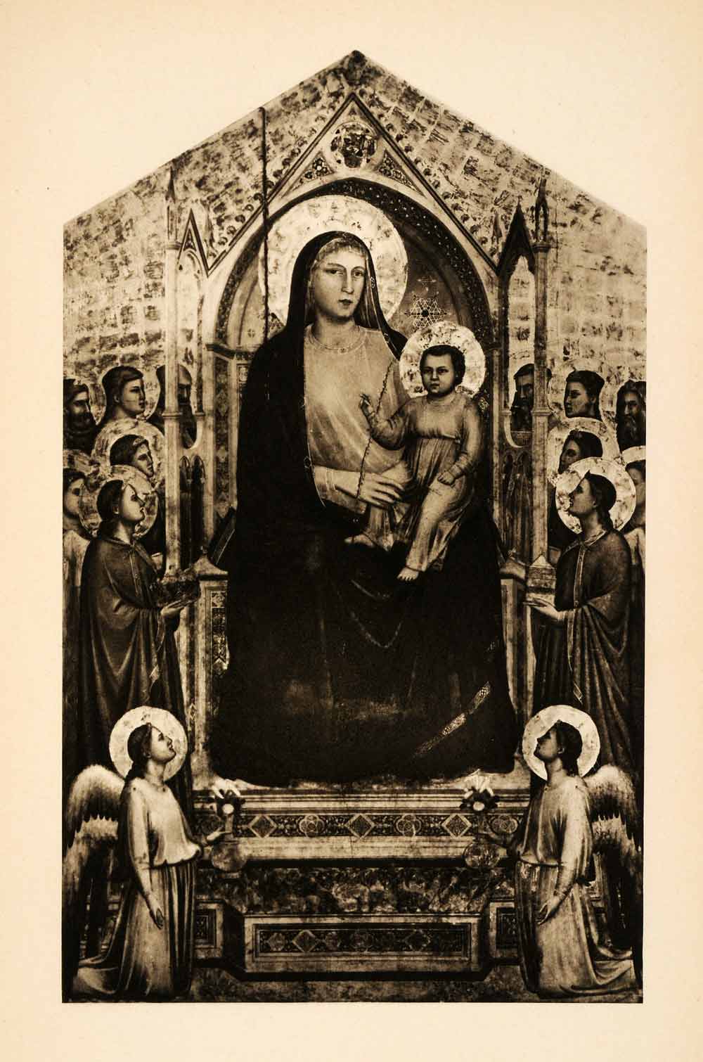 This is an original 1938 black and white photogravure of a painting by medieval Italian painter Giotto di Bondone in which Madonna sits enthrones with the Christ child, surrounded by worshippers.