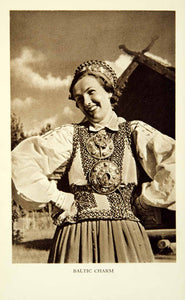 This is an original 1938 black and white photogravure of a photograph of a jovial woman dressed in traditional Baltic folk costume.