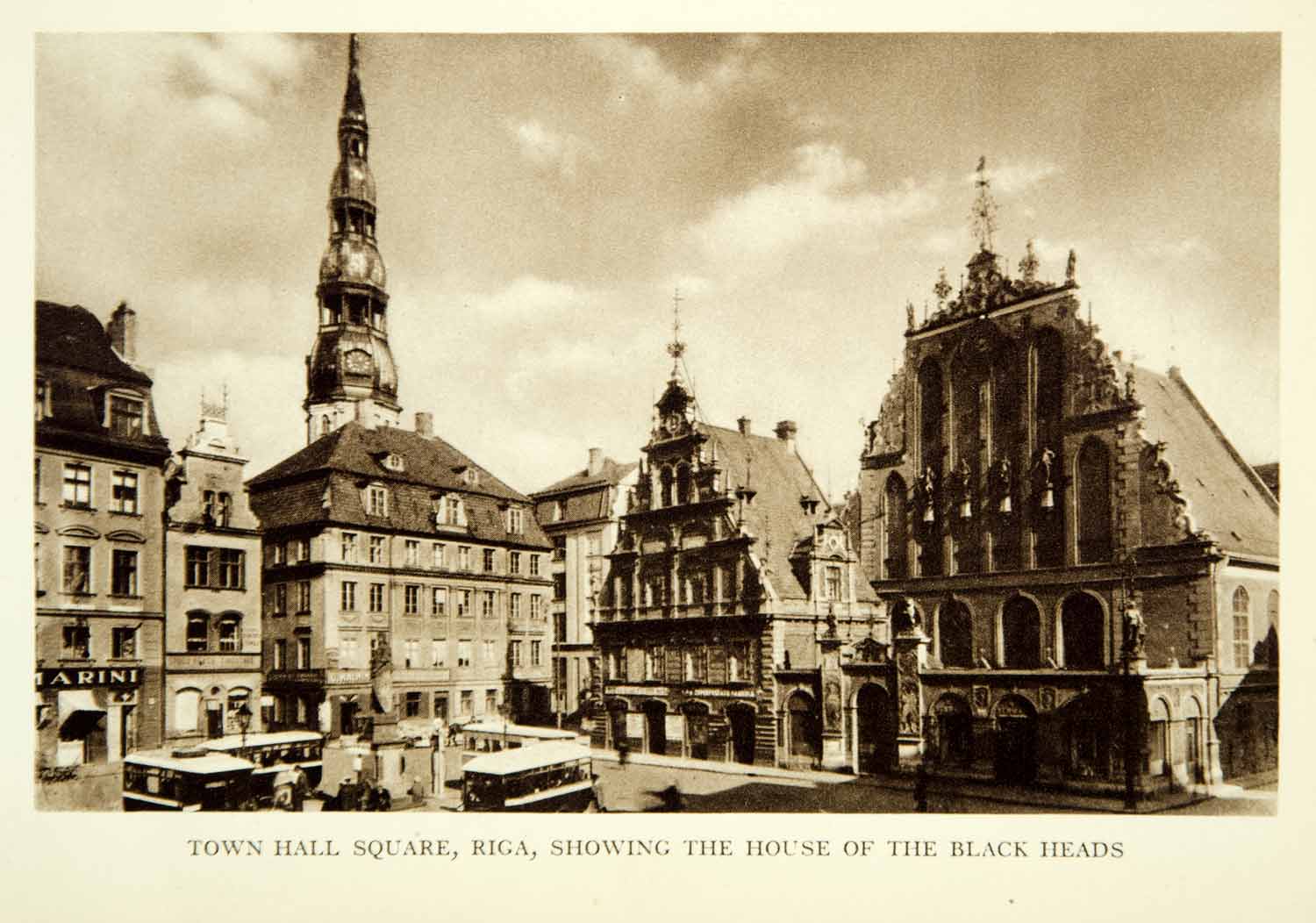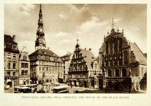 This is an original 1938 black and white photogravure of a photograph of buildings in the old city square of Riga, Latvia, Europe, including the Town Hall and the House of the Blackheads.