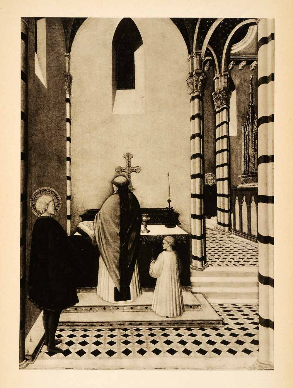This is an original 1938 black and white photogravure of a piece by Sienan artist Stefano di Giovanni di Consolo, better known as Sassetta. The Sienans used a different style of painting than their Florentine counterparts, with more rigid figures and less focus on the natural and more on the mystical. Here we see S. Anthony the Abbot devoting himself to the lord's service.