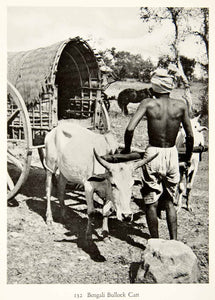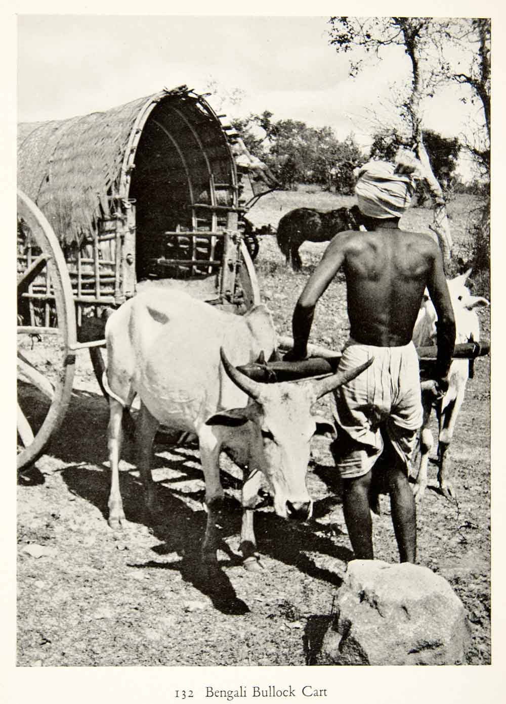 This is an original 1938 black and white halftone print of a Bengali man with a Bull cart in Bengal.