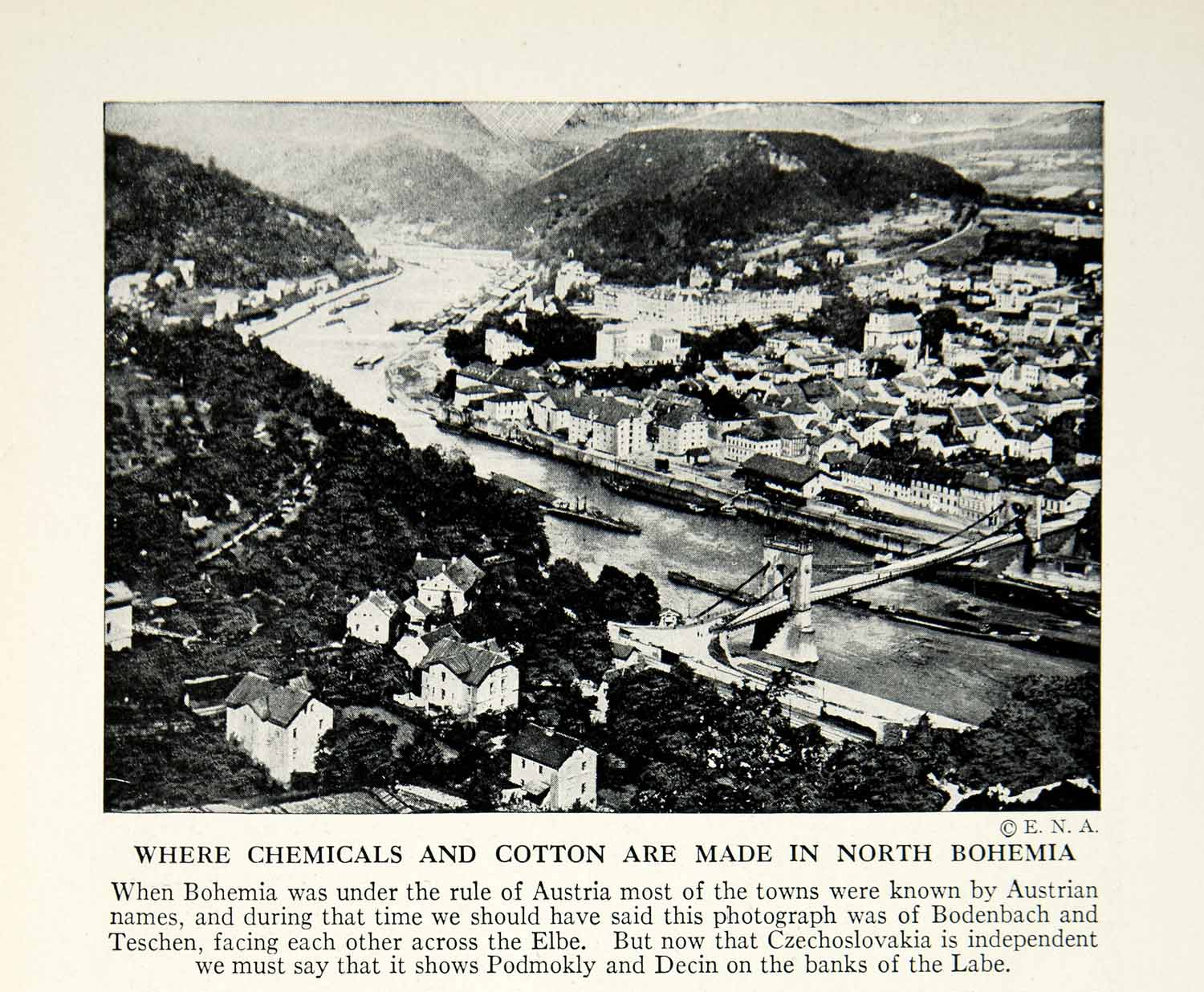 This is an original 1938 black and white halftone print of the towns of Bodenbach and Teschen facing each other across the Elbe River.
