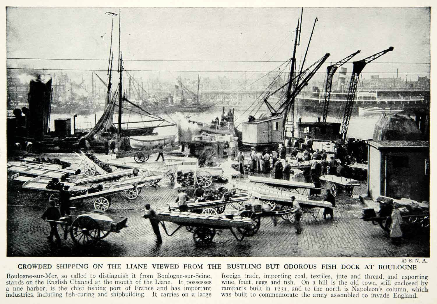 This is an original 1938 black and white halftone print of the docks on the Liane River, in the French city of Boulogne.