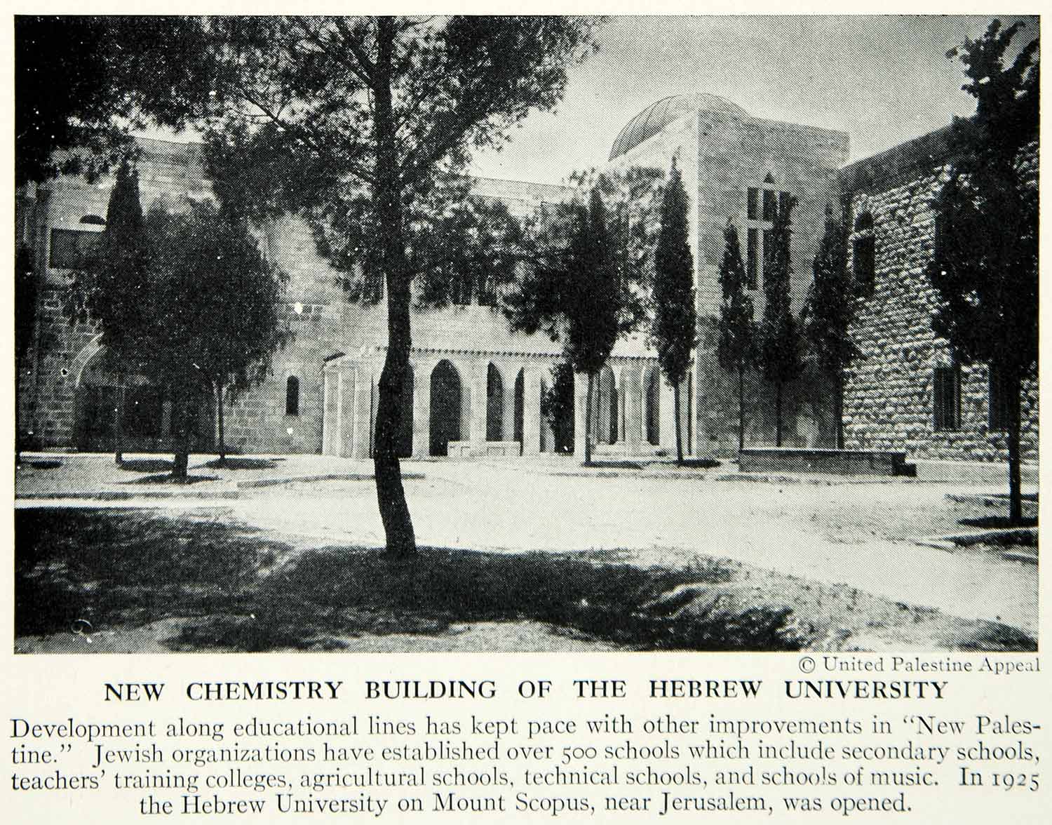 This is an original 1938 black and white halftone print the chemistry building of the Hebrew University found near Jerusalem.