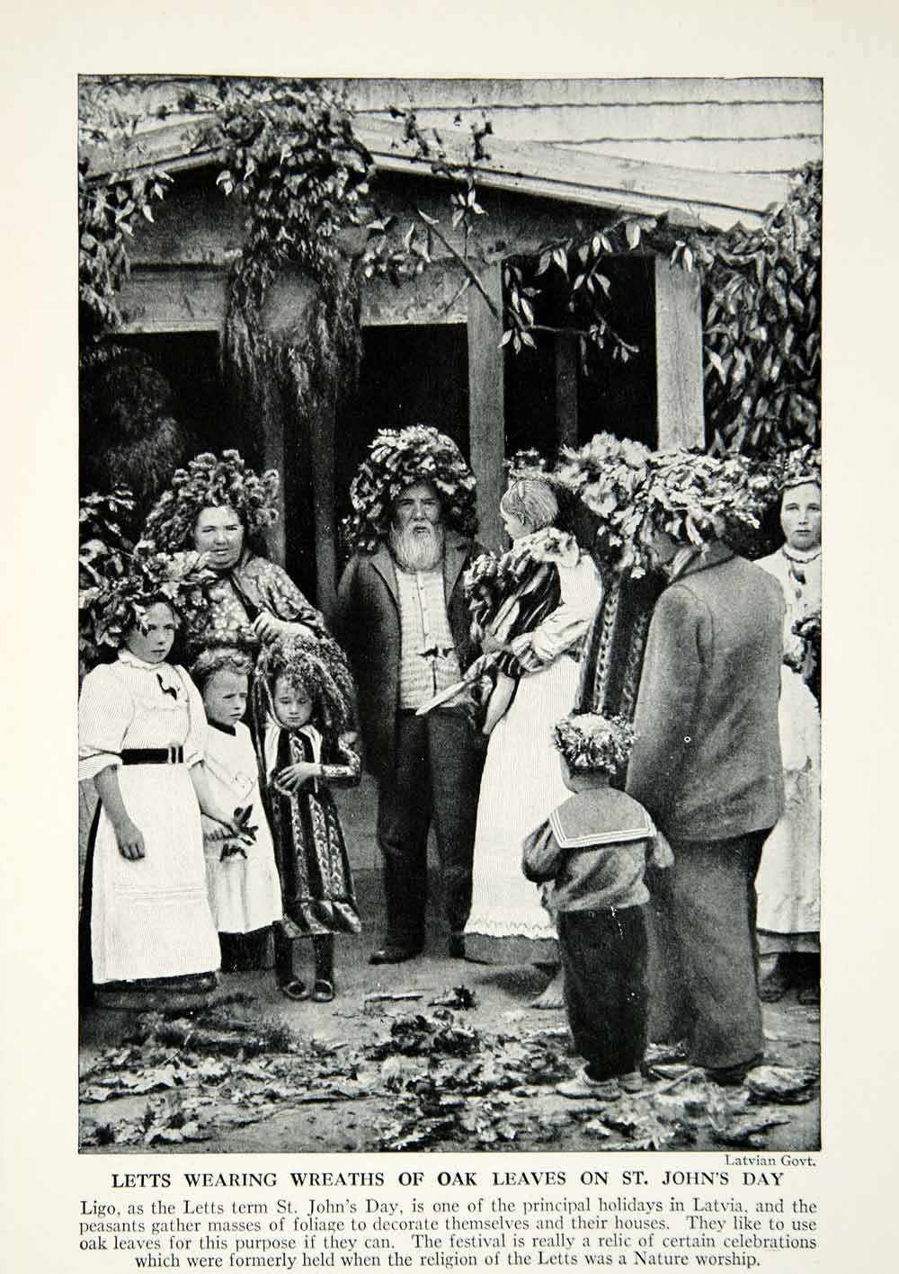 This is an original 1938 black and white halftone print of Lett citizens of Latvia donning oak leaf crowns to commemorate Saint John's Day.