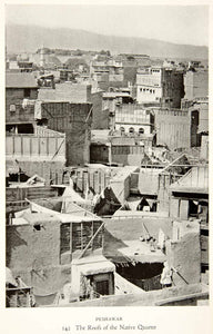 This is an original 1938 black and white halftone print of a cityscape view of the roofs of the native quarters in Peshawar, Pakistan.