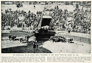 This is an original 1938 black and white halftone print of the Portuguese version of Bullfighting, in which the Bull is not killed.