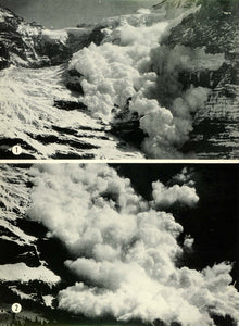 This is an original 1938 halftone print of an image of an avalanche bearing down the Giessen Glacier of the Jungfrau Mountain, which was caused by the warm spring Fohn winds curling through the Swiss Alps in Switzerland.