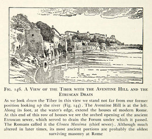This is an original 1938 black and white relief line-block print of the Tiber River and Aventine Hill with a view of the Etruscan drain of the Cloaca Maxima. There is an accompanying paragraph.