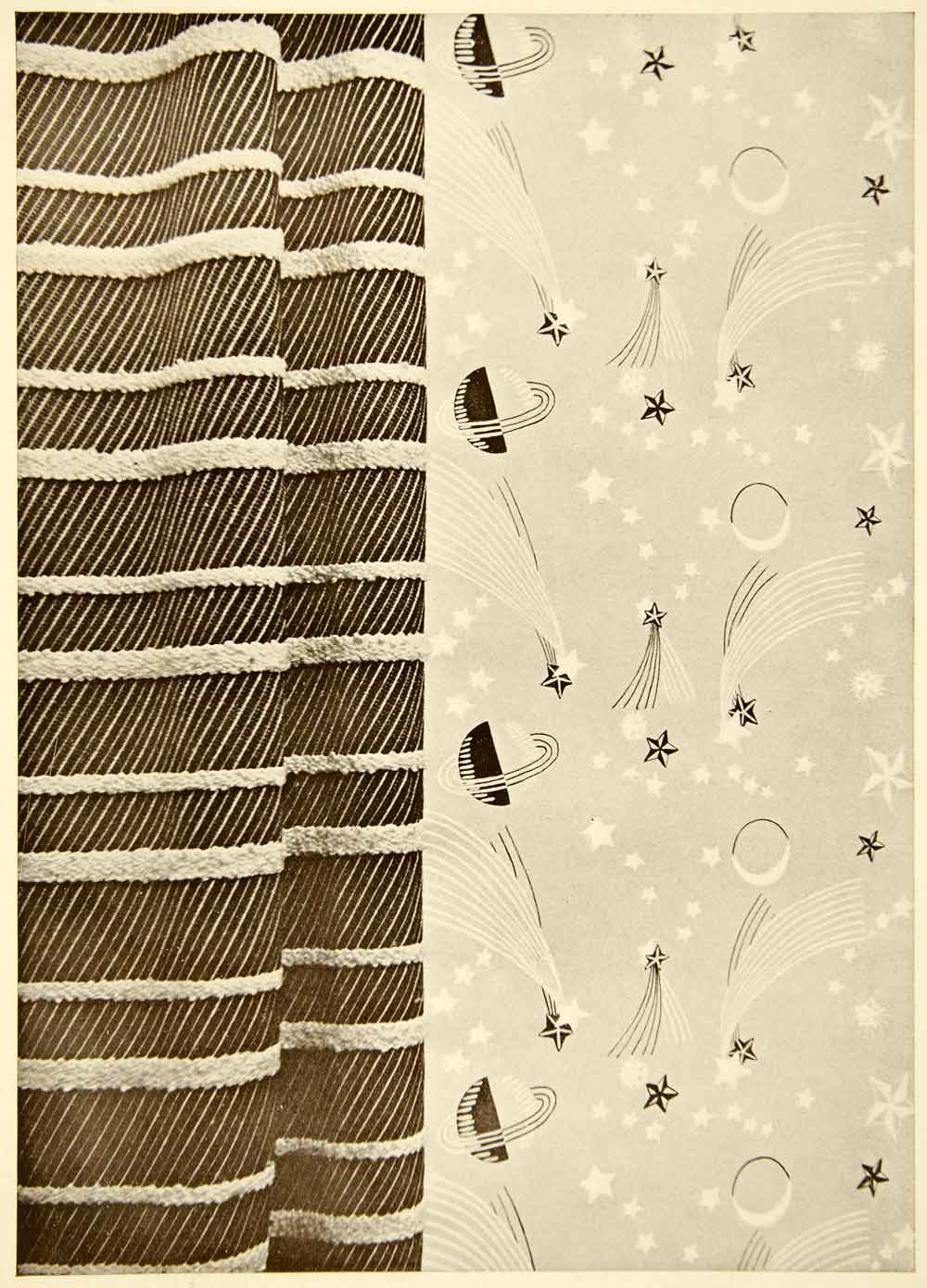This is an original 1938 black and white halftone print of wallpaper and fabric designed by Marion Dorn, Ltd. The curtains were made of a material called, "Navy Harvel," and the wallpaper was named "Constellation."