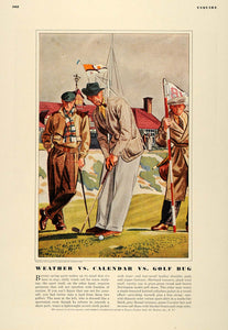 Keywords specific to this image: Golfing, Golf Club, Cavalier Hat, Trousers, Golf Bug, Tweed, Calf Shoes, Crepe Soles, Tobacco Pipe, Smoking, Smoke, Scarf
