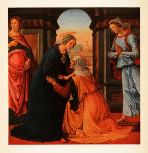 This is an original 1938 color tipped-in print of a piece by Italian Renaissance artist Domenico Ghirlandaio, depicting the visitation of the Virgin Mary to her cousin Elizabeth.