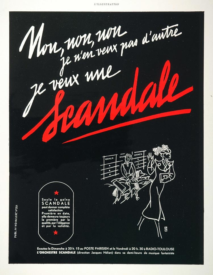 This is an original 1938 two-color French print ad for Scandale lingerie.